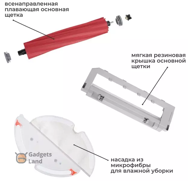 Особенности конструкции: акселерометр, датчик перепада высоты, индикатор заполнения пылесборника, лидар, мусоросборник в базе, мягкий бампер, станция самоочистки, датчик застрявшего колеса, датчик защиты от падения, датчик скорости вентилятора